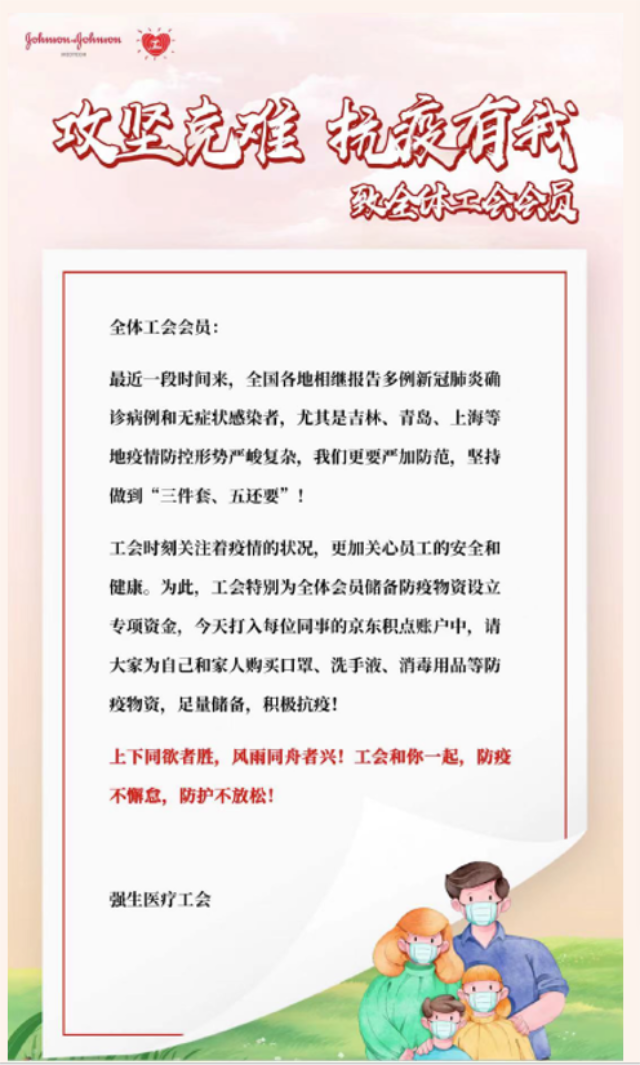 这次疫情全国多地爆发,尤其是上海连日多病例确诊,在严峻的抗疫形势面前,强生(上海)医疗器材有限公司工会联手公司行政管理团队第一时间组织办公室消杀,严格落实进入公司检查核酸记录和健康码的工作,并积极落实好员工食堂的足量配给工作,让员工吃得更健康更安全,在安全舒适的办公环境中下无后顾之忧地正常开展工作。除关爱上海员工之外,工会还在第一时间为分布在全国各地的6000多名员工发放了抗疫物资保障专项慰问,帮助员工守护自己和家人的健康,共同抗击疫情。