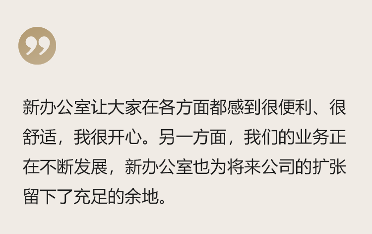 新办公室让大家在各方面都感到很便利、很舒适,我很开心。另一方面,我们的业务正在不断发展,新办公室也为将来公司的扩张留下了充足的余地。”Jimmy说。