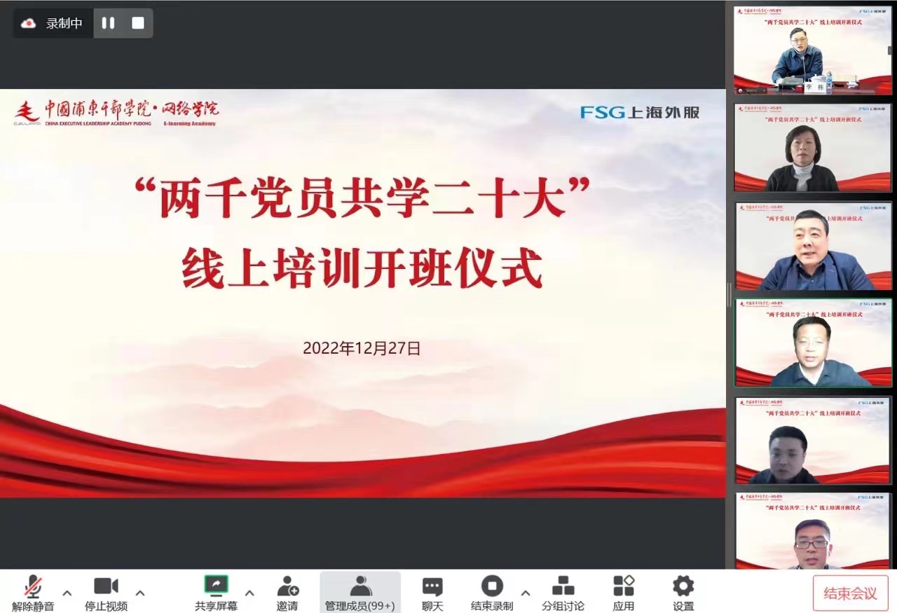 根据东浩兰生集团党委的部署要求,外服党委结合制定下发的《深入学习宣传贯彻党的二十大精神的实施方案》,与中国浦东干部学院网络学院联合开展为期6个月的“两千党员共学二十大”线上培训。12月27日下午,“两千党员共学二十大”线上培训开班仪式通过视频会议召开。中国浦东干部学院副院长、教授郑金洲,东浩兰生集团党委副书记、总裁、外服党委书记、董事长李栋,外服党政领导班子、本部、外企及沪外企业党组织书记参加,会议由外服党委副书记、纪委书记支峰主持。