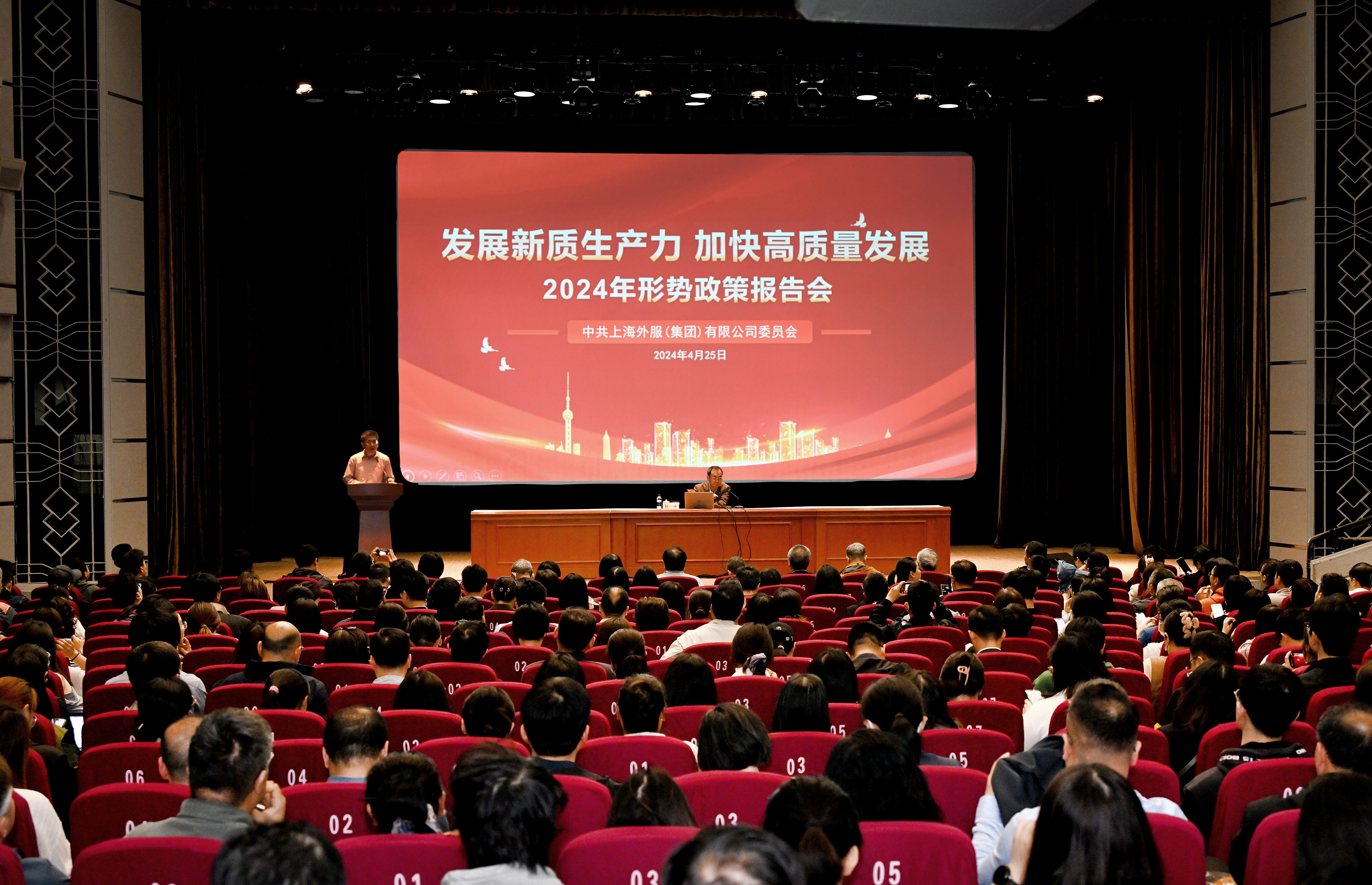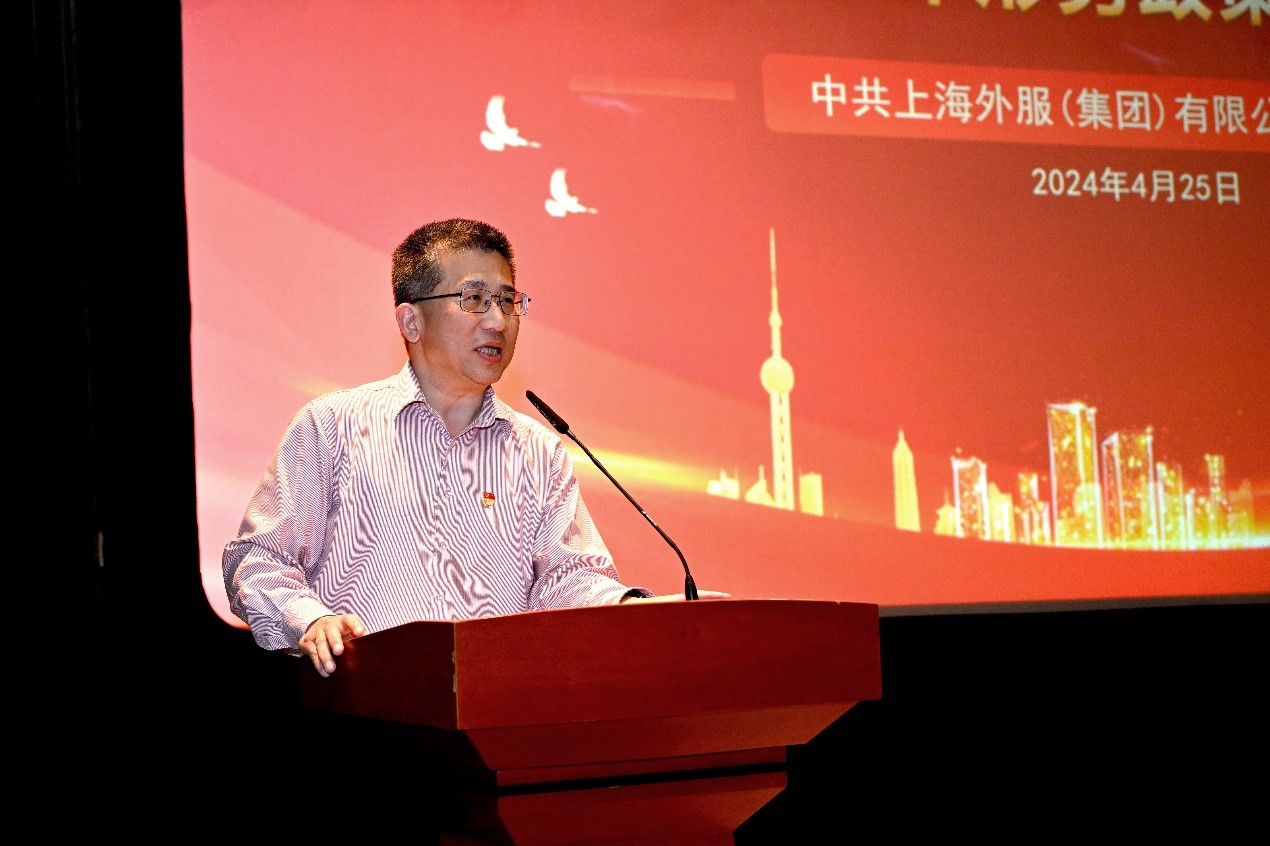 4月25日晚,外服党委召开2024年形势政策报告会,邀请全国人大代表、上海社会科学院党委书记权衡作辅导报告。外服党委书记、董事长、总裁陈伟权等领导班子成员,以及本部、离退休和外企党员代表,团干部、党外人士代表500余人参加。