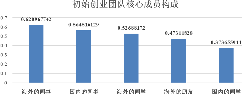 技术资源(51.4%)、人脉资源(54.2%)和团队资源(40.2%)是在沪海归创业者最依赖的海外资源,他们大多利用其建立科技优势、组建创业团队和发展商业人脉。初始创业团队核心主要由海外同事(62.1%)、国内同事(56.5%)、和海外同学(52.7%)构成。