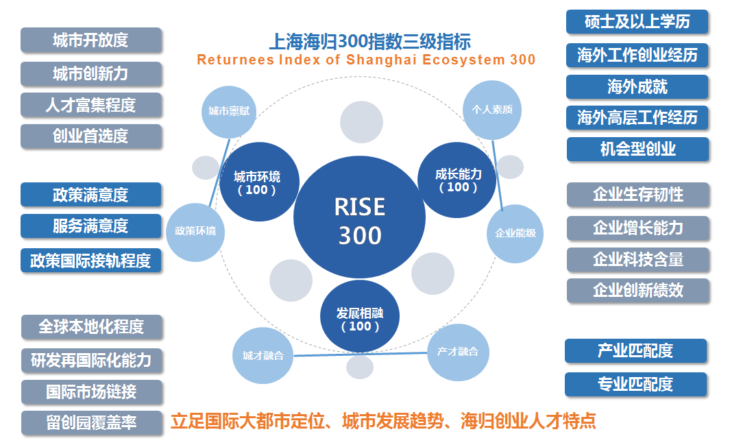 该报告将海归群体作为研究对象,以海归特征与上海城市软实力的匹配度和互促性为主题,围绕城市自身环境、海归成长能力以及两者关系这三个方面,构建起基于“城市环境”“成长能力”“发展相融”3个满分100的一级指标、“城市禀赋”“政策环境”“个人素质”“企业能级”“产才融合”“城才融合”6个二级指标以及22个具体指标的全新衡量指标体系。其中,超过半数指标针对海归创业者量身创设,彰显了海归人才与城市“因城而聚、因才而兴、与城共进”的互动魅力。