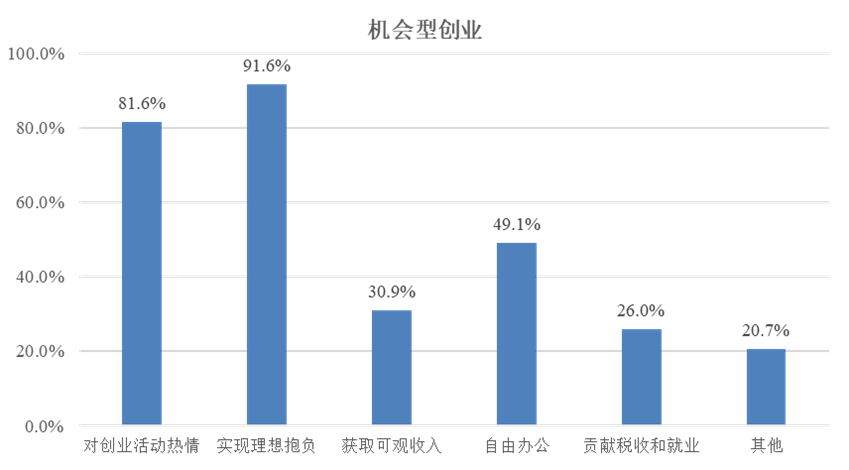 调研对象的主要创业动机属于机会型而非生存型,其中91.6%表示创业是为实现理想抱负,81.6%表示是对创业活动充满热情。