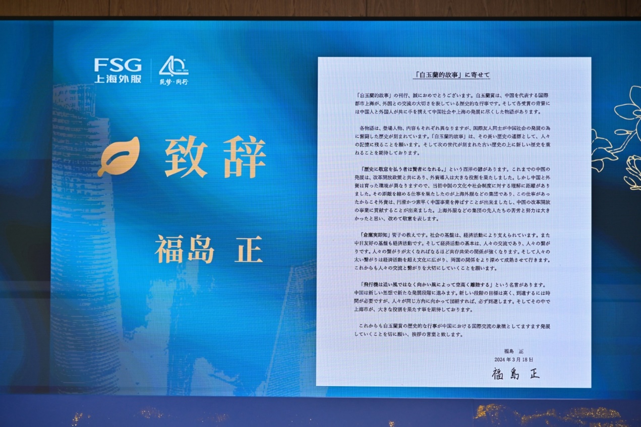 福岛正则在贺词中强调,“白玉兰奖”背后的每一个故事都记录了国际友人为中国社会的发展而奋斗的历史,希望《白玉兰的故事》能成为历史的里程碑。他赞扬上海外服帮助外资企业理解中国、促进外企在中国的发展、助力外企对改革开放作出贡献,并向外服人员的努力致敬。他期待中国的新发展阶段中,上海能扮演更重要角色。