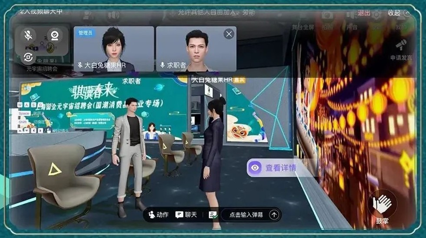 小小界面,大大舞台。招聘会上,大白兔糖果、老凤祥、回力、蜂花、雷允上、上海国际饭店等20个知名国潮品牌坐镇元宇宙展台,为职场弄潮儿们展现深厚的民族企业实力,提供引领潮流新势力的关键岗位,共舞未来职场秀台。企业HR搭配一对一语音和文字小灶以全新的虚拟形象在展台全程驻场,解答求职疑问,助骐骥之跃。求职者还能使用“手动捏脸”打造个性化的专属形象进行面试互动、简历投递,以数字化的方式表达真实的自己。本次元宇宙招聘会,共发布2024届校招岗位660个,2926名以大学生为主体的青年求职者参加了活动并向自己心仪的校招岗位投递了简历。