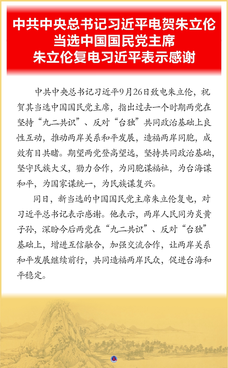 同日,新当选的中国国民党主席朱立伦复电,对习近平总书记表示感谢。他表示,两岸人民同为炎黄子孙,深盼今后两党在“九二共识”、反对“台独”基础上,增进互信融合,加强交流合作,让两岸关系和平发展继续前行,共同造福两岸民众,促进台海和平稳定。