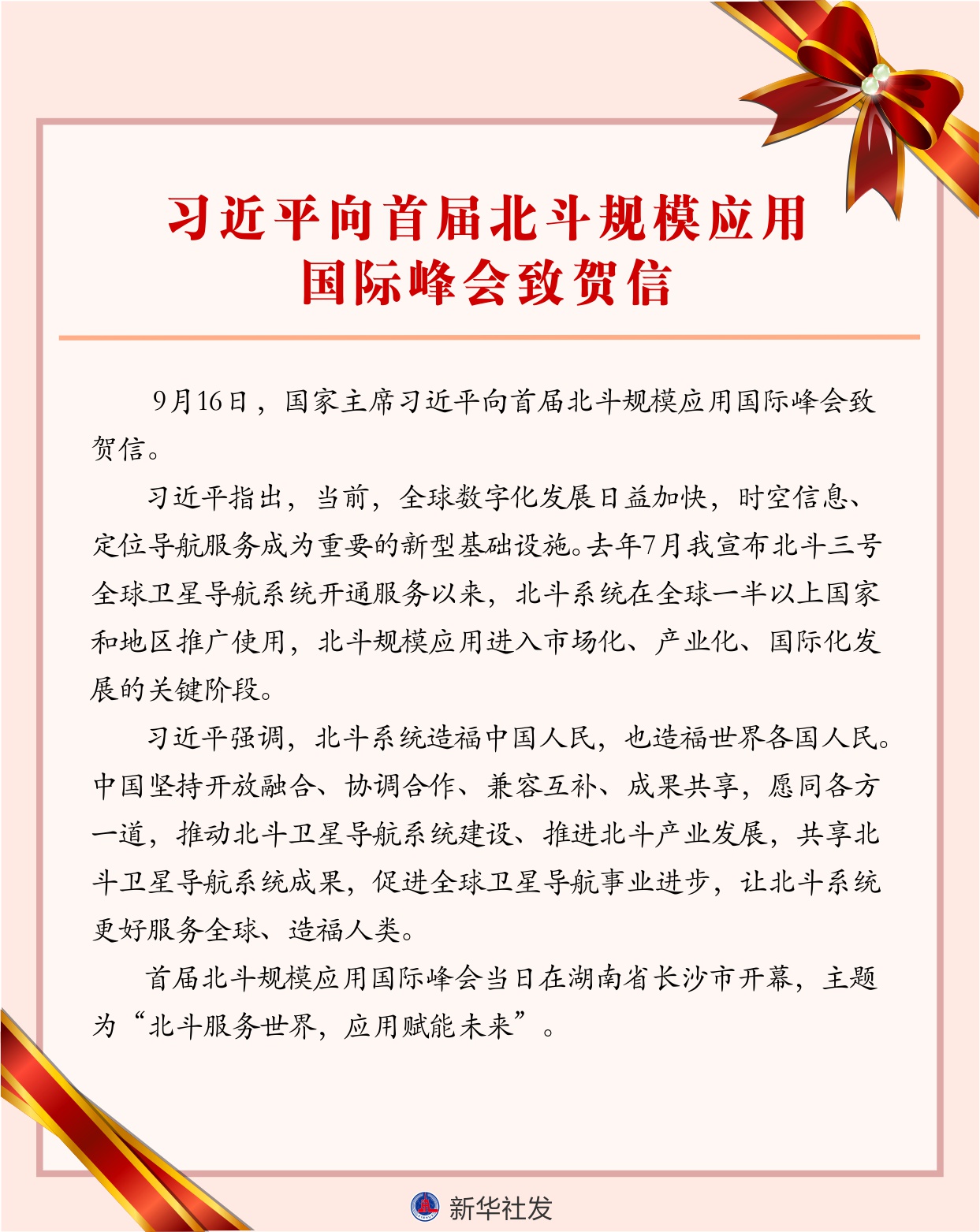 9月16日,国家主席习近平向首届北斗规模应用国际峰会致贺信。