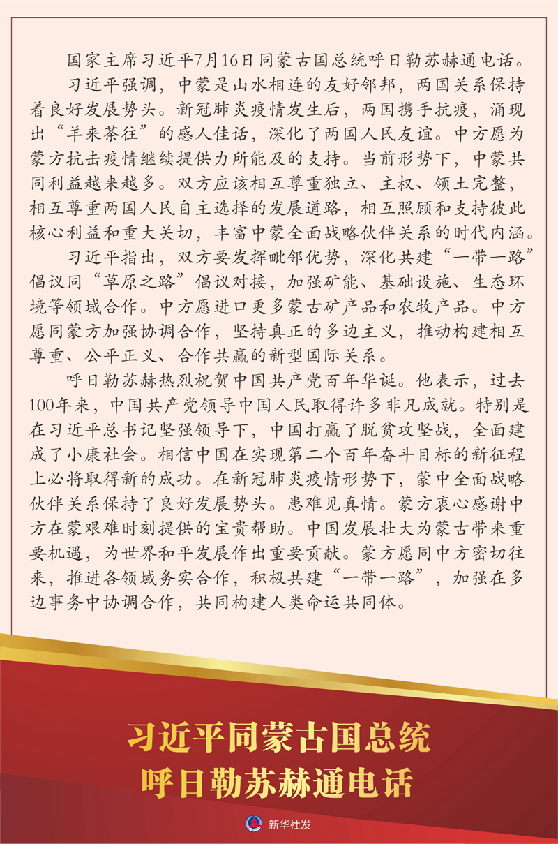 国家主席习近平7月16日同蒙古国总统呼日勒苏赫通电话。