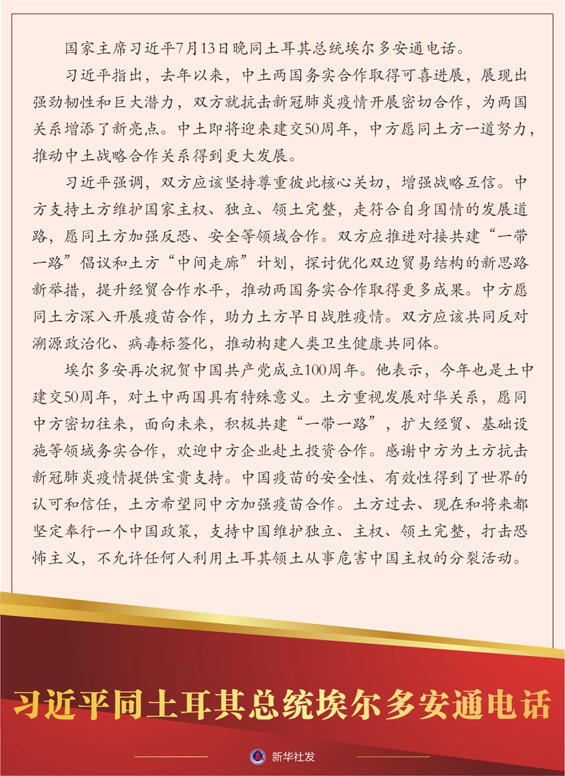 国家主席习近平7月13日晚同土耳其总统埃尔多安通电话。