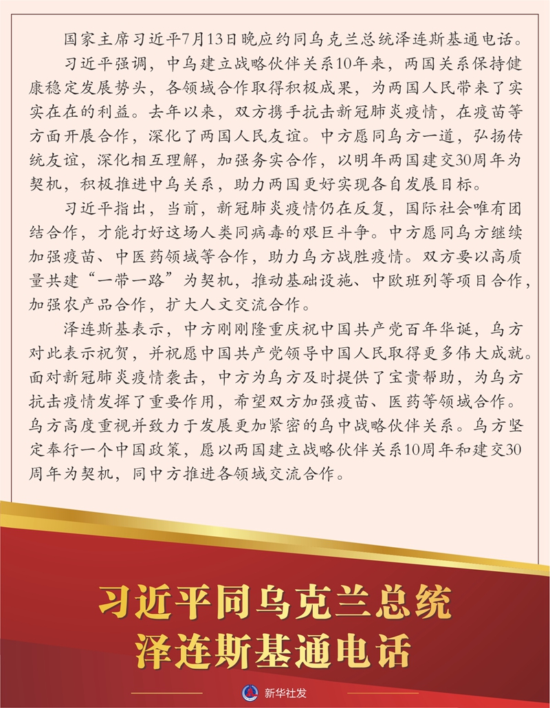 国家主席习近平7月13日晚应约同乌克兰总统泽连斯基通电话。