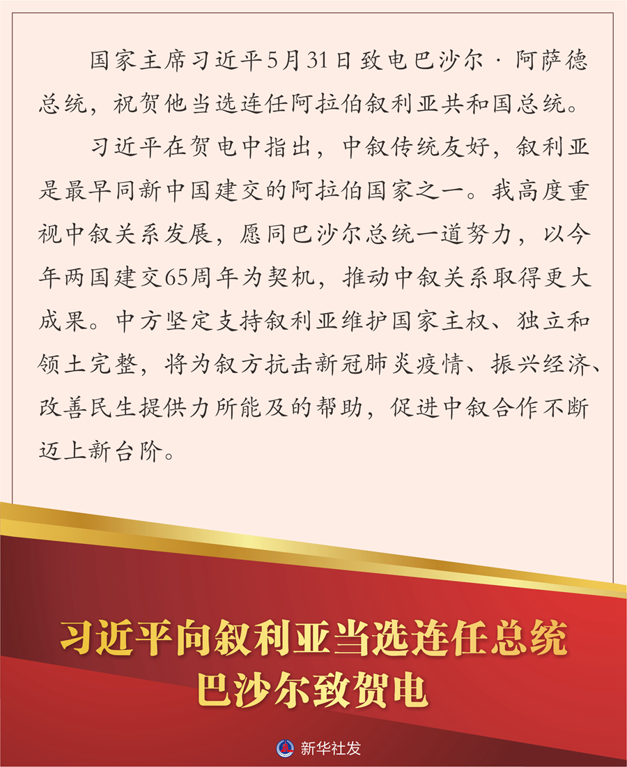 国家主席习近平5月31日致电巴沙尔·阿萨德总统,祝贺他当选连任阿拉伯叙利亚共和国总统。