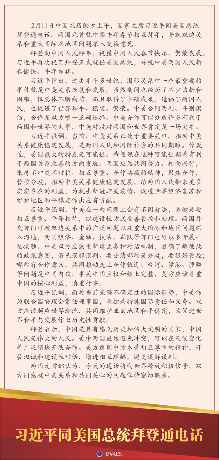 2月11日中国农历除夕上午,国家主席习近平同美国总统拜登通电话。两国元首就中国牛年春节相互拜年,并就双边关系和重大国际及地区问题深入交换意见。