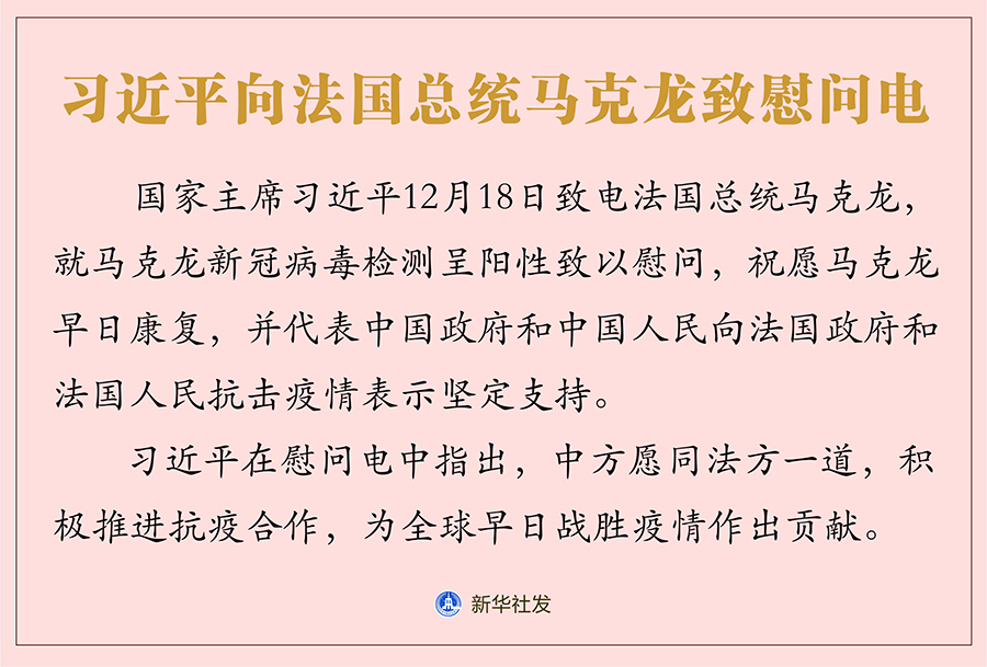 国家主席习近平18日致电法国总统马克龙,就马克龙新冠病毒检测呈阳性致以慰问,祝愿马克龙早日康复,并代表中国政府和中国人民向法国政府和法国人民抗击疫情表示坚定支持。
