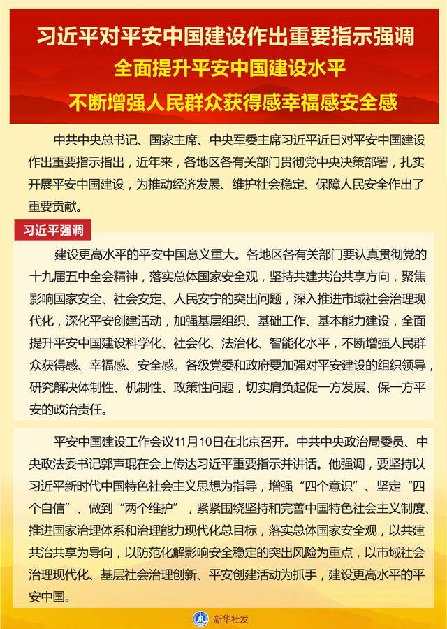 习近平强调,建设更高水平的平安中国意义重大。各地区各有关部门要认真贯彻党的十九届五中全会精神,落实总体国家安全观,坚持共建共治共享方向,聚焦影响国家安全、社会安定、人民安宁的突出问题,深入推进市域社会治理现代化,深化平安创建活动,加强基层组织、基础工作、基本能力建设,全面提升平安中国建设科学化、社会化、法治化、智能化水平,不断增强人民群众获得感、幸福感、安全感。各级党委和政府要加强对平安建设的组织领导,研究解决体制性、机制性、政策性问题,切实肩负起促一方发展、保一方平安的政治责任。