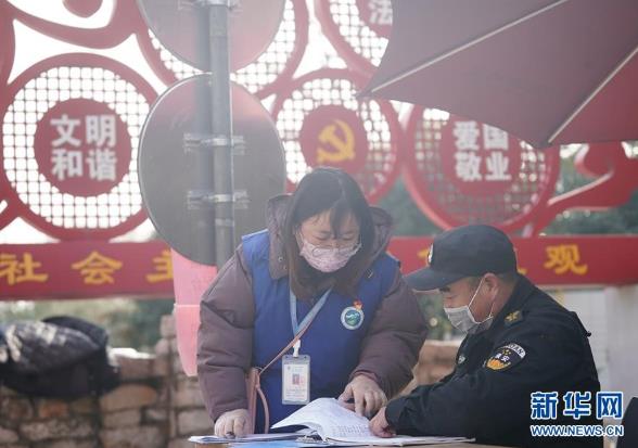 2月5日,在南京市江宁区秣陵街道牛首社区一处小区门前,网格员陶慧(左)在跟保安核对人员登记信息。江苏省共调动12万个网格内的近30万名网格员,运用“大数据+网格化”等手段,精准滚动摸排,在疫情防控基层一线织起一张严密的“防护网”。 新华社记者 季春鹏 摄