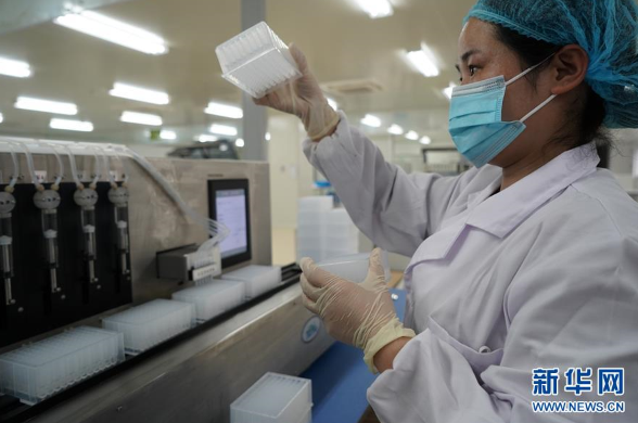 在位于江苏泰州医药高新区的江苏康为世纪生物科技有限公司,工作人员生产病毒核酸提取试剂盒产品(4月16日摄)。 新华社记者 韩瑜庆 摄