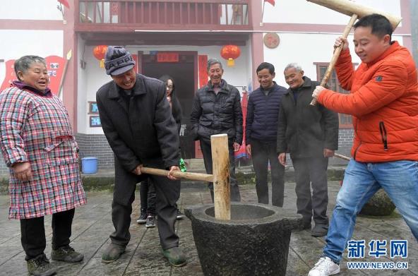 江西省井冈山市茅坪乡神山村村民在打糍粑(1月15日摄)。 新华社记者 彭昭之 摄