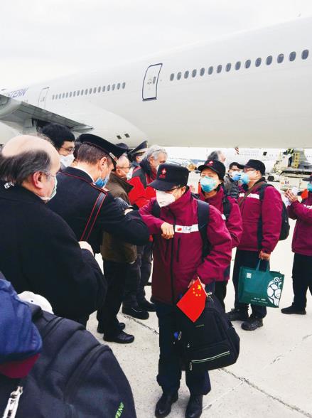 2020年3月25日,在意大利米兰马尔奔萨机场,意方人员以“击肘”的方式欢迎中国第三批赴意大利抗疫医疗专家组成员的到来。中国第三批赴意大利抗疫医疗专家组一行14人25日抵达米兰马尔奔萨机场。专家组由国家卫生健康委员会组建,成员由福建省卫健委选派,并随所乘飞机携带了呼吸机、监护仪、口罩等中方捐助的医疗物资。 新华社发