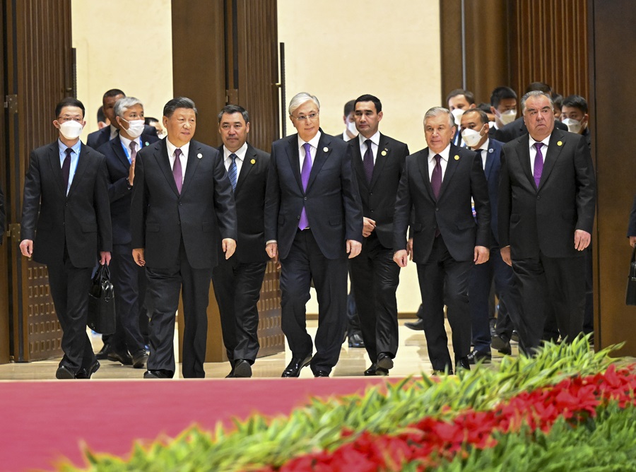 5月19日,中国-中亚峰会在西安国际会议中心成功举行,国家主席习近平同哈萨克斯坦总统托卡耶夫、吉尔吉斯斯坦总统扎帕罗夫、塔吉克斯坦总统拉赫蒙、土库曼斯坦总统别尔德穆哈梅多夫、乌兹别克斯坦总统米尔济约耶夫共同会见记者。这是习近平同中亚五国元首共同步入会场。新华社记者 李学仁 摄